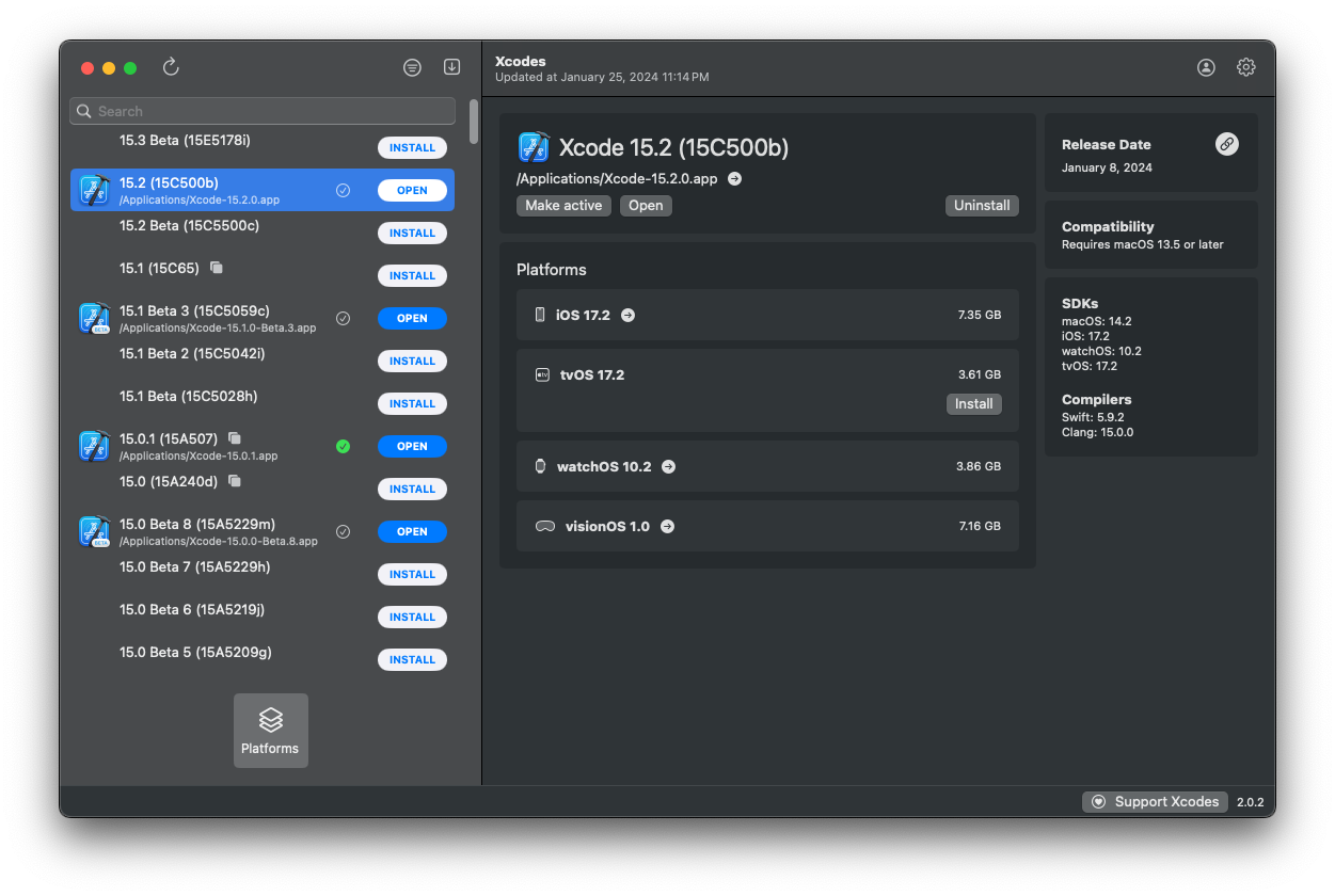 • Xcodes supports downloading the Apple runtimes via the app. Simply click on the Platform, and Xcodes will install automatically for you.