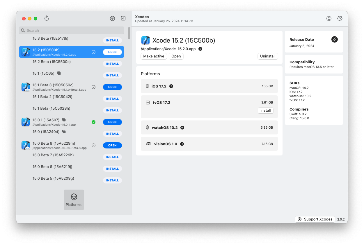 • Xcodes supports downloading the Apple runtimes via the app. Simply click on the Platform, and Xcodes will install automatically for you.